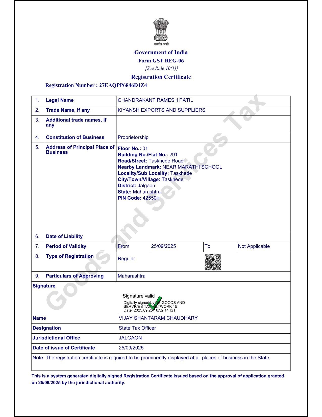 Address: At Post Taskhede, Tal. Raver, Dist. Jalgaon, Maharashtra – 425501